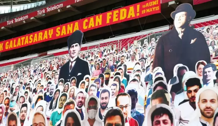 Sarı kırmızılı kulüpten yapılan açıklamada, "Ulu önderimiz Mustafa Kemal Atatürk, ölümsüz kurucumuz Ali Sami Yen, sağlık çalışanlarımız ve #SensizOlmazGalatasaray diyen büyük Galatasaray taraftarlarının fotoğrafları tribünlerimizdeki yerini aldı" ifadeleri yer aldı.