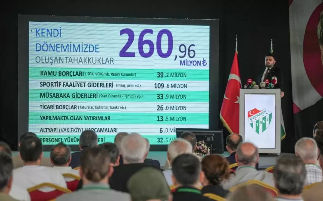 Bursaspor Başkanı Enes Çelik, Merinos Atatürk Kongre ve Kültür Merkezi’nde gerçekleştirilen Olağan Mali ve İdari Genel Kurulu'nda Bursaspor'un kalan ve ödenen borçları açıkladı.