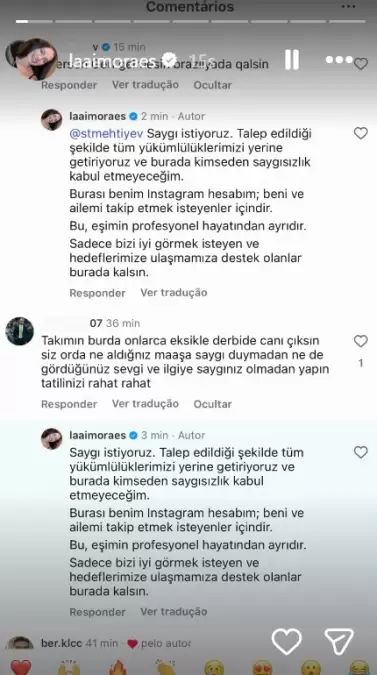 Taraftarın, “Ederson geri gelmesin, Brezilya'da kalsın” mesajına Lais Moraes, “Saygı istiyoruz. Talep edildiği şekilde tüm yükümlülüklerimizi yerine getiriyoruz ve burada kimseden saygısızlık kabul etmeyeceğim. Burası benim Instagram hesabım; beni ve ailemi takip etmek isteyenler içindir. Bu, eşimin profesyonel hayatından ayrıdır. Sadece bizi iyi görmek isteyen ve hedeflerimize ulaşmamıza destek olanlar burada kalsın.” yanıtını verdi.