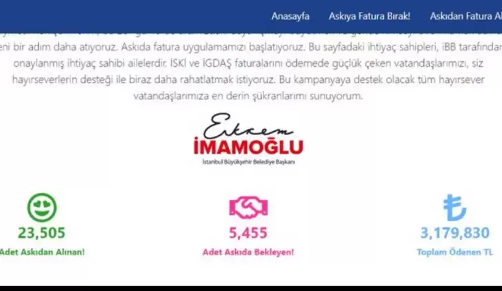 Ekrem İmamoğlu: ''Kıymetli hemşehrilerim; bu zor günlerde aramızdaki dayanışmayı büyütmek ve geride kimseyi bırakmamak adına yeni bir adım daha atıyoruz. Askıda fatura uygulamamızı başlatıyoruz. Bu sayfadaki ihtiyaç sahipleri, iBB tarafından onaylanmış ihtiyaç sahibi ailelerdir. İSKİ ve İGDAŞ faturalarını ödemede güçlük çeken vatandaşlarımızı, siz hayırseverlerin desteği ile biraz daha rahatlatmak istiyoruz. Bu kampanyaya destek olacak tüm hayırsever vatandaşlarımıza en derin şükranlarımı sunuyorum.''