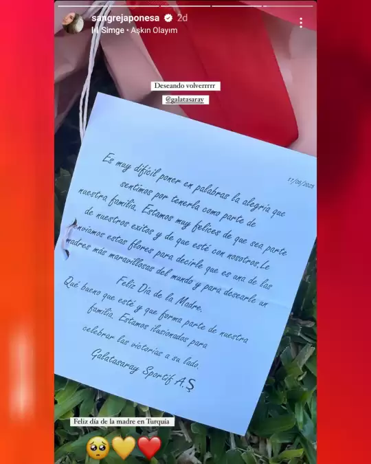 Sarı-kırmızılı yönetimin gönderdiği tebrik mesajında ise, "Onu ailemizin bir parçası olarak aramızda görmekten duyduğumuz mutluluğu kelimelerle anlatmak çok zor. Başarılarımızda yer almanızdan ve yanımızda olmanızdan dolayı çok mutluyuz. Bu çiçekleri sana, dünyanın en harika annelerinden biri olduğunu söylemek ve Anneler Günü'nü kutlamak için gönderiyoruz.
