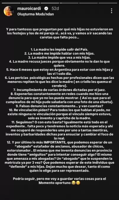 Sosyal medya hesabından uzun bir mesaj yazan Icardi, eski eşi Wanda Nara'nın çocukları kendisine göstermesine izin vermediğini ve hakimlerin kararını reddettiğini söyledi.